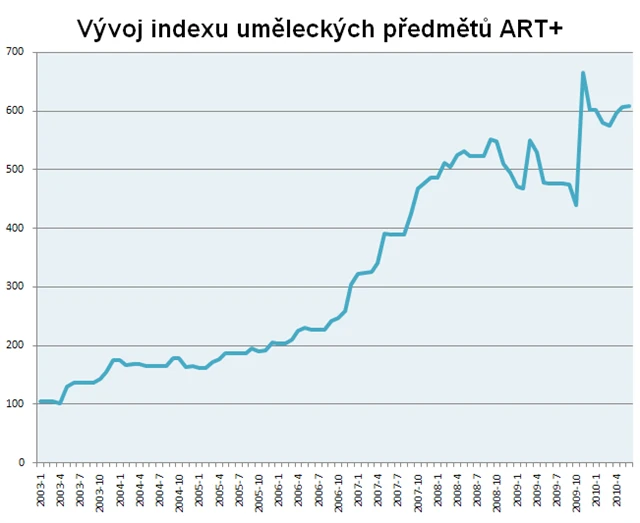 Na indexu ART+ se tyto dva rozdílné trendy – propad v určitých kategoriích a růst v jiných – projevily výraznější fluktuací. Zatímco do podzimu 2008 index rostl kontinuálně, loni vykazoval výraznější pohyby v obou směrech. V předchozích letech totiž trh rostl ve všech kategoriích, zatímco loni byl tažen hlavně nejdražšími položkami.