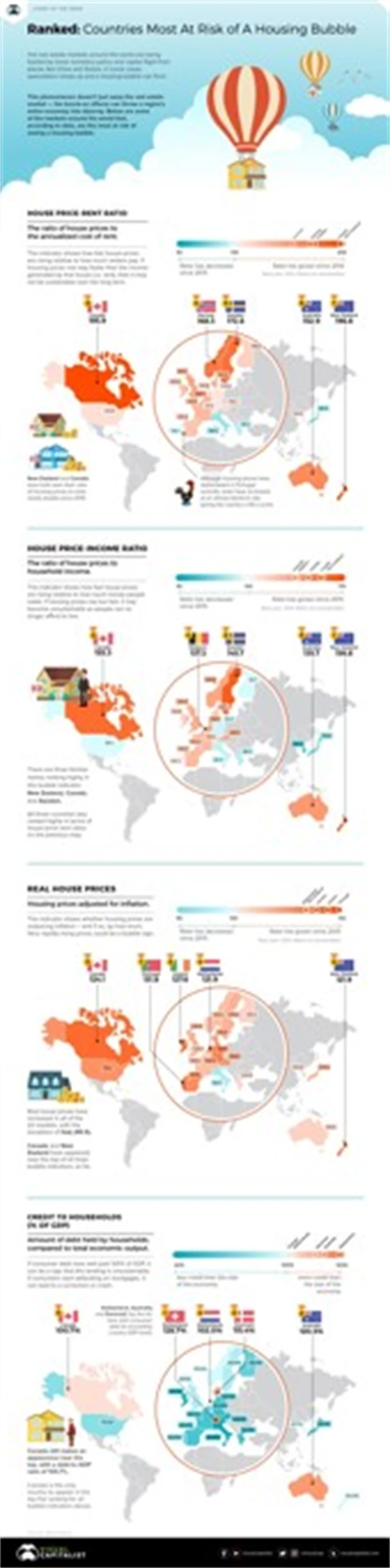V žebříčku podle rychlosti růstu poměru cen nemovitostí k příjmům se o první příčku dělí Nový Zéland a Kanada. Následují Švédsko, Belgie a Austrálie. Ceny nemovitostí očištěné o vliv inflace od roku 2015 nejvíce stouply v Portugalsku a Irsku a z hlediska poměru zadlužení domácností k národnímu HDP jsou na tom nejhůře Švýcarsko, Austrálie a Dánsko.