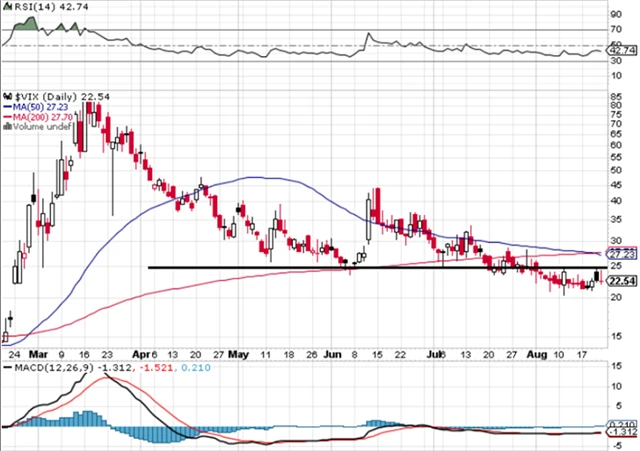 Index volatility VIX uzavřel o něco výše než před týdnem. Zůstal ale pod 25 body a po půl roce je jeho 50denní klouzavý průměr pod 200denním. Pro akcie tak vysílá spíše pozitivní signál.
