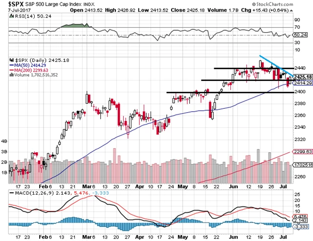 Index S&P 500 za týden přidal 0,07 %, takže lze jen stěží hledat důvody, proč by se měl měnit technický pohled na ceny akcií jako celku. Index sice v týdnu jednou uzavřel pod supportem na 2 420, ale v pátek se vrátil nad něj.