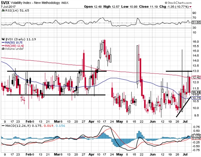 Index volatility VIX si v týdnu vyrazil "až" k 13 bodům, v pátek ale uzavřel jen těsně nad 11. Pro akcie tak nadále vysílá býčí signál. Nelze si ale nevšimnout, že se na grafu zhruba od poloviny června formuje opatrný vzestupný trend, byť zatím stále na velice nízkých hladinách. Denní uzavření nad 13 body by bylo medvědím signálem.