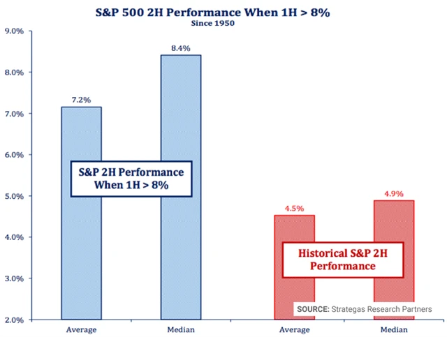 Stratégové na Wall Street jsou pro druhou polovinu roku zatím opatrní, v průměru na konci roku čekají hodnotu indexu S&P 500 jen lehce nad 2 400. Historicky jsou ale druhá pololetí po silných růstech v prvních dvou kvartálech roku (letos +8,1 %) v průměru i podle mediánu růstová. Analytici, kteří sledují jednotlivé akcie, pak podle cílových cen jednotlivých titulů a jejich promítnutím do hodnoty indexu naopak čekají něco okolo 2 600 bodů. Vybere si trh zlatou střední cestu?