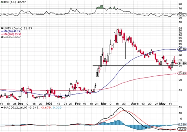 Index volatility VIX je nad 30 body a nad 200denním klouzavým průměrem. Pro akcie aktuálně stále vysílá nepříznivý signál.