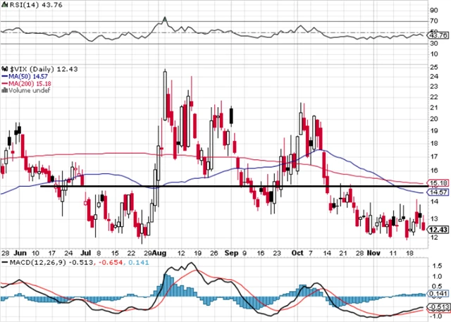 Index volatility VIX je stále na nízké úrovni a pro akcie vysílá býčí signál. Změnu trendu by naznačoval až vzestup indexu nad 15.