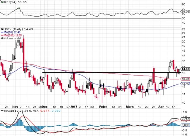 Index volatility VIX zůstává nad 14 a pro akcie vysílá negativní signál. Že by příprava na sezónně tradičně slabý květen?
