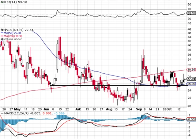 Index volatility VIX se zatím příliš nemění a drží se mezi klouzavými průměry, tedy mezi 25 a 30. Zůstává tak na vyšších úrovních, ačkoli ceny akcií od konce září rostou.
