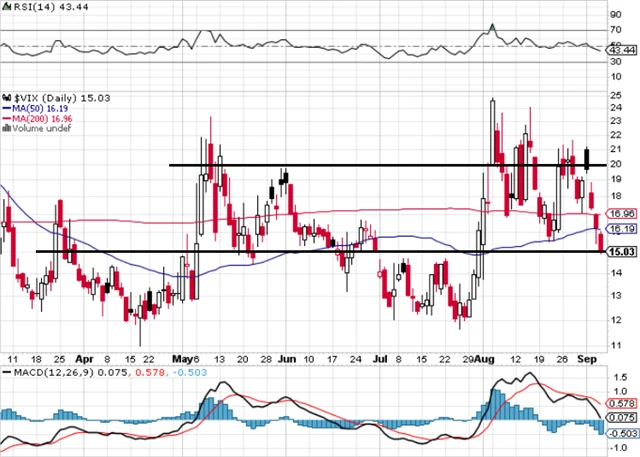 Index volatility VIX je na 15 bodech a pod oběma sledovanými klouzavými průměry. Ukazuje na zklidnění a pro akcie vysílá optimistický signál.