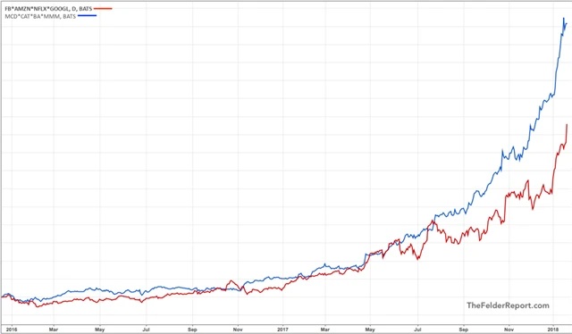 Čtveřici zmíněných společností tvoří McDonald's, Caterpillar, Boeing a 3M (označme si je jako MCBM). Graf vývoje cen akcií pro ně hovoří celkem jasně.