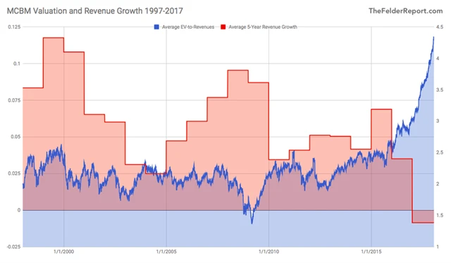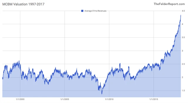 To by ale samo o sobě nebylo tak zajímavé, výkonnějších titulů než FANG bychom našli desítky, byť možná ne s tak velkou tržní kapitalizací. Za zmínku ale stojí, že ocenění MCBM podle ukazatele EV/S (poměr hodnoty firmy a tržeb) se v uplynulých 20 letech pohybovalo v rozmezí 1,5-2,5. Platilo to i během internetové či realitní bubliny. V roce 2016 ovšem jejich valuace vyletěly vzhůru.