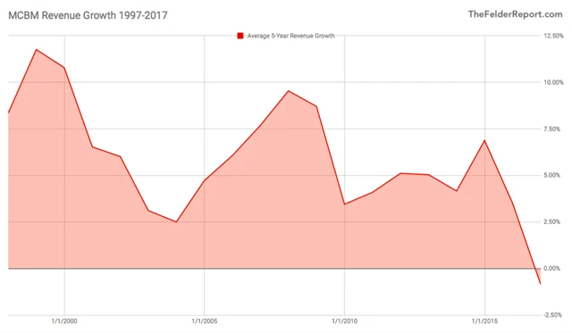 Bylo by logické se domnívat (alespoň historicky tomu tak na akciovém trhu bylo), že vývoj cen akcií odrážel kondici samotných firem, tedy růst jejich byznysu. V případě MCBM to ovšem tak docela neplatí, stačí se podívat na vývoj tržeb za posledních pět let.