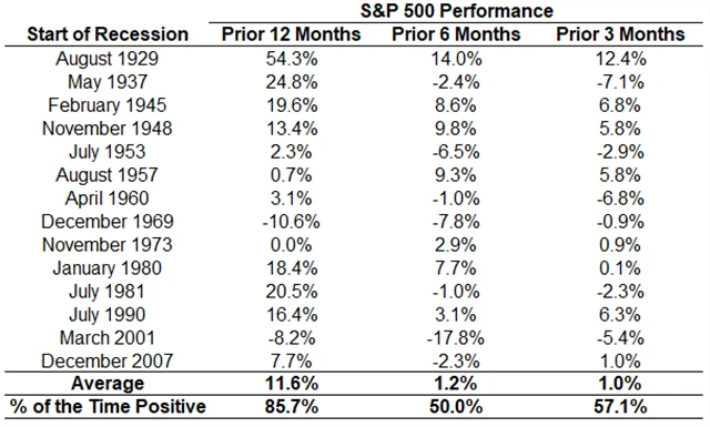 Ani výnosová křivka, která je také považována za ukazatel blížící se recese, v poslední době v tomto smyslu "nefunguje". Mohou fungovat akcie? Podívejme se na výnosy indexu S&P 500 v období 3, 6 a 12 měsíců před recesemi v USA od konce 20. let 20. století.