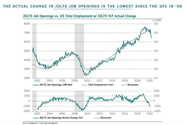 Bittel tvrdí, že sledujeme podobný vývoj jako v roce 2008. Argumentuje přitom mimo jiné statistikou JOLTS, tedy údaji o počtu nabízených volných pracovních míst v USA. Jejich meziroční úbytek je nejvýraznější od poslední finanční krize.