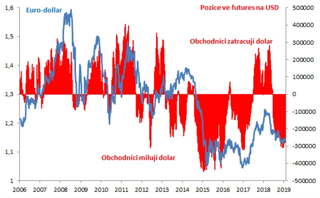 Pozice nejsou nástrojem na časování trhu. Aktuální sázky na dolar neznamenají, že je oslabení dolaru na spadnutí. Pozice jsou však důležitým indikátorem délky a síly trendu, když dojde k obratu. Zvětšují šanci na to, že naskočíme-li do nového trendu, bude to stát za to. Tak jako loni, kdy byl dolar v opačné pozici než nyní (nemilovaný a s fundamenty, které hovořily proti němu). Obrat přitom stál za to, konkrétně šlo o 10 centů v páru s eurem a další 3 centy na úrocích.