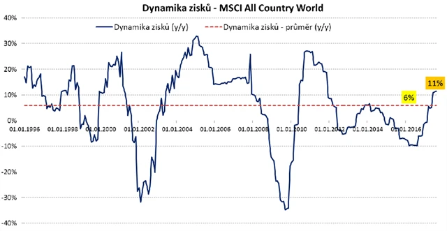 Aktuální růst korporátních zisků globálně dosahuje 11 % meziročně. Dynamika růstu zisků se zdá být na cyklickém vrcholu, pro příští rok analytici momentálně očekávají růst již jen o 9 %.