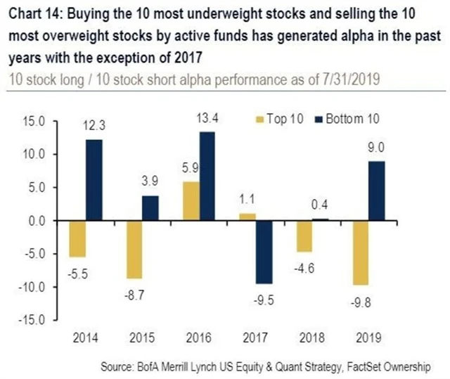 O čem konkrétně je řeč? Od roku 2013 do konce prvního pololetí 2019 se jako vynikající strategie ukazuje spekulace na pokles akcií firem, které jsou v portfoliích největších hedgeových fondů v první desítce nejoblíbenějších dlouhých pozic, a naopak nákup akcií společností, jež hedgeové fondy řadí na prvních deset míst svého SHORT listu. Výjimkou byl pouze rok 2017, zato v letošním prvním pololetí zmíněná TOP 10 hedgeových fondů zaostala za jejich BOTTOM 10 o plných 19 procentních bodů.