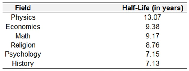 Poločasem rozpadu vědění se zabývala také profesorka Rong Tangová ze School of Library and Information Science na bostonské Simmons University. Konkrétně se snažila přijít na to, jak dlouho trvá, než jsou odborné publikace v určitých oblastech nahrazeny jako zastaralé nebo aktualizovány.