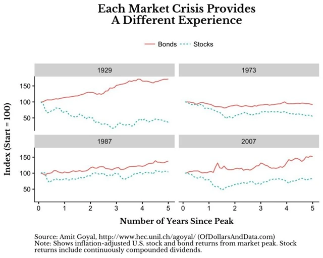 Investoři sice mohli investovat do stejných akcií, ale pro investory ve 30. a 40. letech minulého století byly výsledné zkušenosti mnohem horší než pro ty v 80. a 90. letech. Podobně lze porovnat výnosy z akcií a dluhopisů v průběhu největších akciových propadů. Když začneme na vrcholech před krachem, výsledky budou v každém období jiné.
