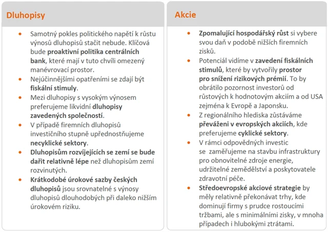 Některé hospodářské ukazatele i významní ekonomové naznačují, že by světový růst v příštím roce neměl být tak silný. Základní premisou je dlouhotrvající obchodní válka mezi Čínou a USA, která již způsobila ochlazení ekonomické aktivity v některých sektorech, což není pro akciové trhy dobré znamení. Trhy by však mělo podpořit prostředí nízkých úrokových sazeb, které bude podle nás přetrvávat.