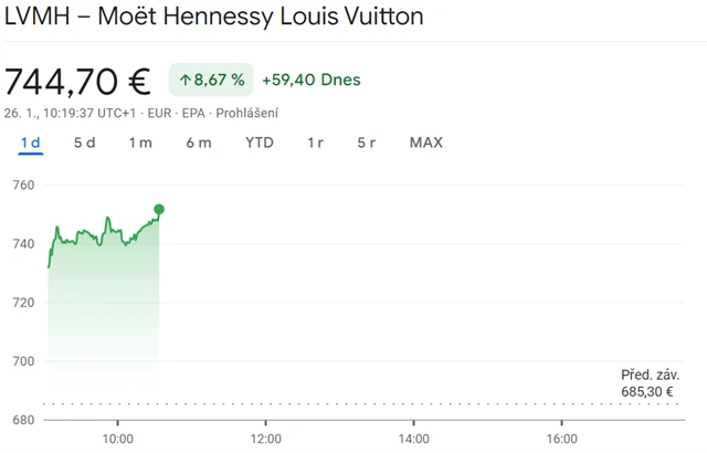 Výsledky LVMH za rok 2023: Čistý zisk 15,17 miliardy EUR (odhad: 15,68 miliardy EUR), tržby 86,15 miliardy EUR (odhad: 85,74 miliardy EUR, meziročně: +13 %). Společnost navrhuje dividendu 13 EUR na akcii. Akcie společnosti přidávají přes 8,5 %