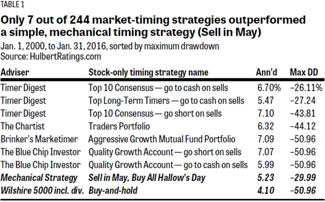 Hulbert porovnával strategie s klasickým přístupem "kup a drž", ale také s mechanickým přístupem, kdy investor prodá akcie na konci dubna a opět je nakoupí na konci října (Sell in May and Go Away). Některé strategie využívaly při prodeji akcií pouze hotovost (go to cash on sells), některé umožňovaly využívání krátkých pozic (go short on sells), což se také projevilo na výkonnosti.