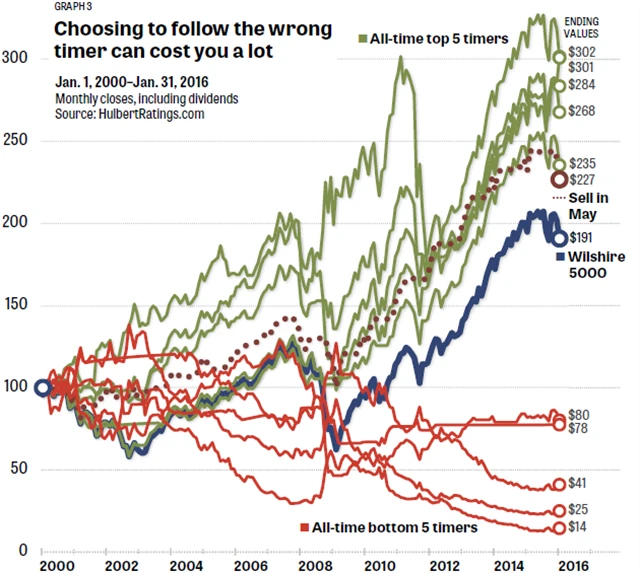 Že časování trhu dlouhodobě nefunguje, není žádná novinka. Možná se občas někomu nějakou dobu daří předvídat změny trendu, ale z dlouhodobého hlediska je tento přístup pro většinu investorů ztrátový. Mark Hulbert z webu Marketwatch studoval doporučení, která svým klientům nabízejí poradenské a investiční společnosti. V rámci publikace Hulbert Financial Digest po 36 let sledoval, kolik peněz by investoři mohli vydělat či prodělat, kdyby se řídili těmito doporučeními.