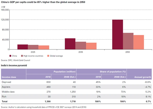 Zvyšovat by se měla poptávka po investičním zlatě v Číně, která by měla vystřídat Spojené státy na pozici největší světové ekonomiky. Pozitivně by na poptávku po investičním kovu měl působit především růst čínské střední třídy. Solidně by se mělo dařit i indické ekonomice, a Indie by tak měla na trhu s investičním zlatem jít ve stopách Číny.