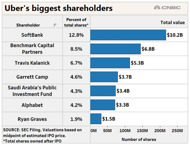 Pokud by Uber upsal akcie po 47 USD, tedy uprostřed stanoveného cenové rozpětí, nejvíce by na tom získala SoftBank. Spoluzakladatelé firmy Travis Kalanick a Garrett Camp by si přišli na více než 5 miliard, respektive 3,7 miliardy USD. To není špatné, když jde o firmu ve ztrátě, jež se před IPO nezdráhala varovat, že v ní možná také navždy zůstane.