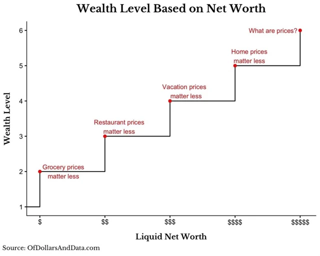 Dobře to vyjadřuje následující grafika zobrazující to, jak lidé s růstem hodnoty svého likvidního majetku postupně věnují méně pozornosti různým typům výdajů, tedy jak se postupně stávají finančně nezávislými.