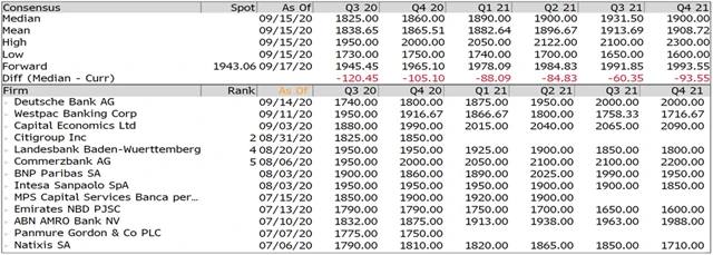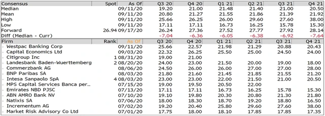 Jaký názor mají na zlato, stříbro a ropu světoví analytici? Jaké jsou jejich čtvrtletní cílové ceny? Nabízíme jejich přehled, jak jej k 17. 9. 2020 shromáždila agentura Bloomberg. (30. 9. 2020)